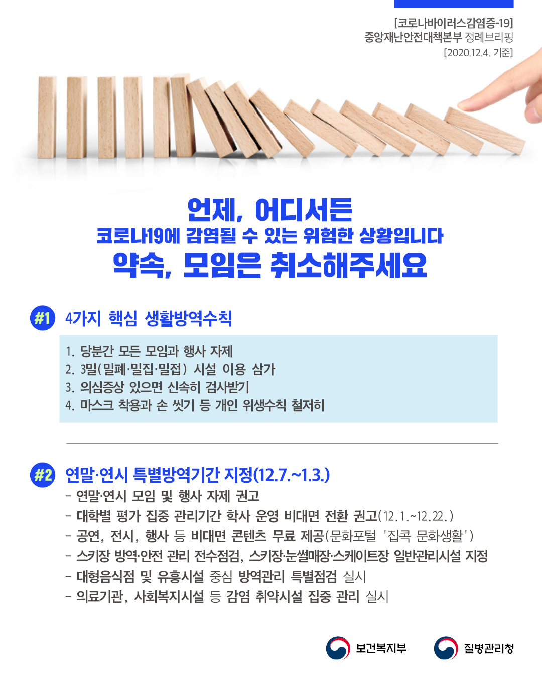 우선 정부에서는 4가지 핵심 생활방역수칙과 연말·연시 특별방역기간 지정 (12.7.~1.3.) 캠페인을 내놓았네요.