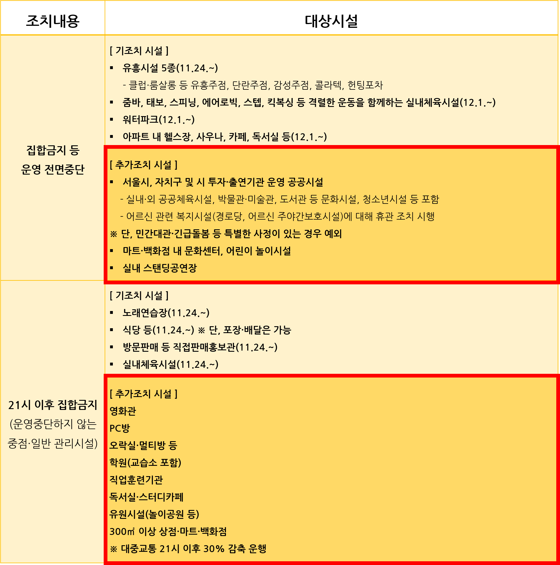 • 300평방미터 미만 소규모 마트와 음식점 포장/배달을 제외한 모든 시설들의 21시 이후 영업중단