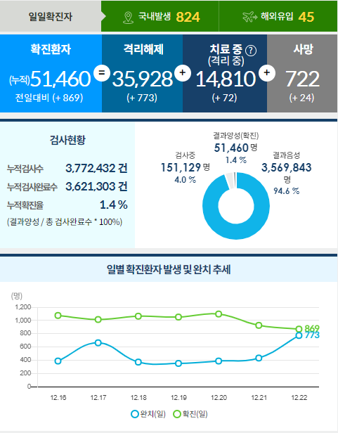 일일 확진자는 869명(12.22 0시 기준), 누적 확진자는 51,460명이라고 합니다.