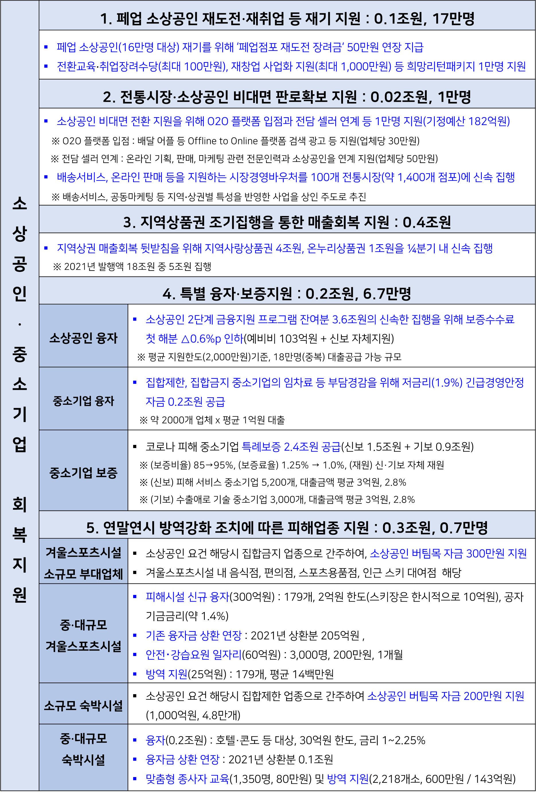 - 소상공인의 조기 피해 극복을 위한 재도전‧재취업, 판로 확보, 매출 회복 등 지원
