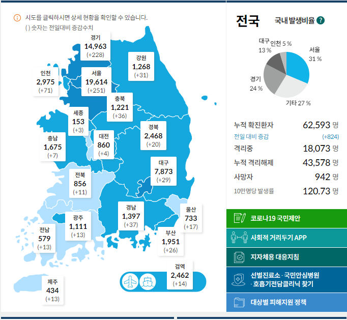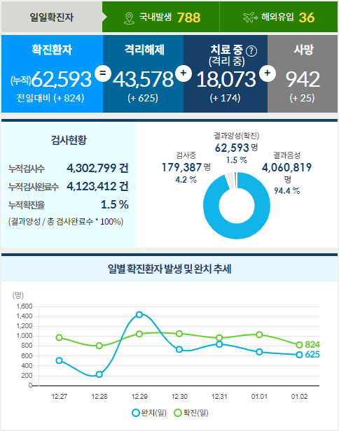 일일 확진자는 824명(01.02 00시 기준), 누적 확진자는 62,593명이라고 합니다.