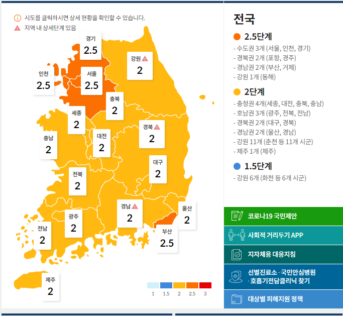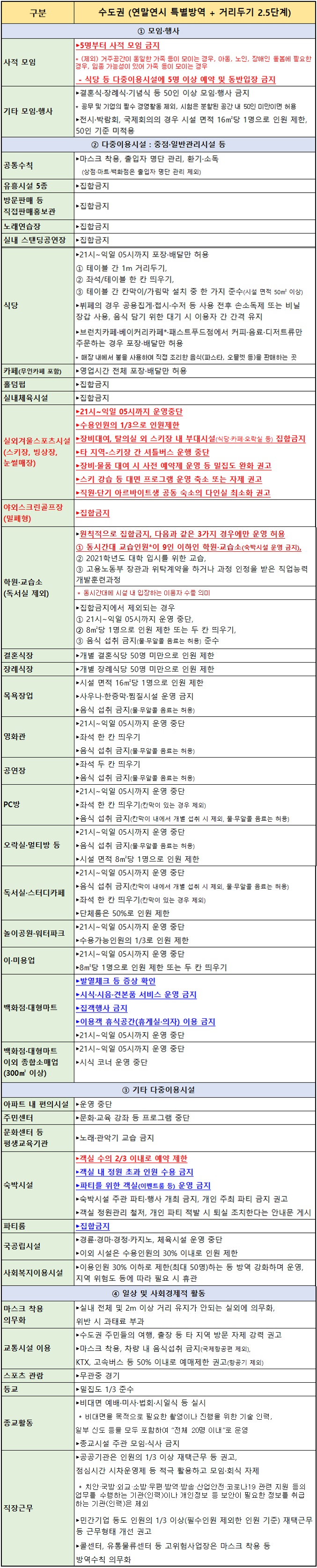 수도권(2.5단계)·비수도권(2단계)의 현재 거리 두기 단계별 조치를