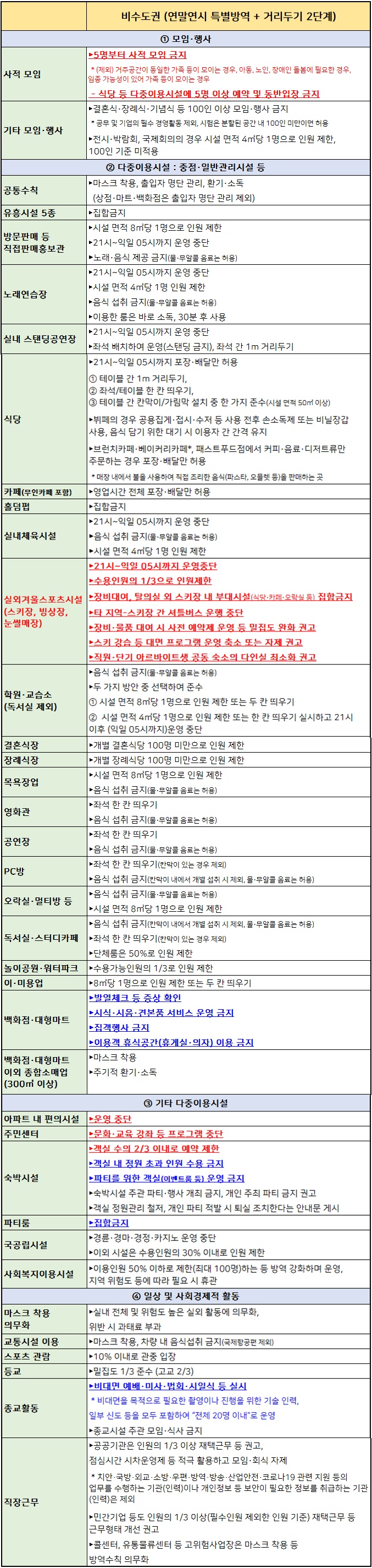 참고로 파란색 볼드체(밑줄)로 작성된 부분은 연말연시 특별방역대책 중 계속 적용되는 조치,