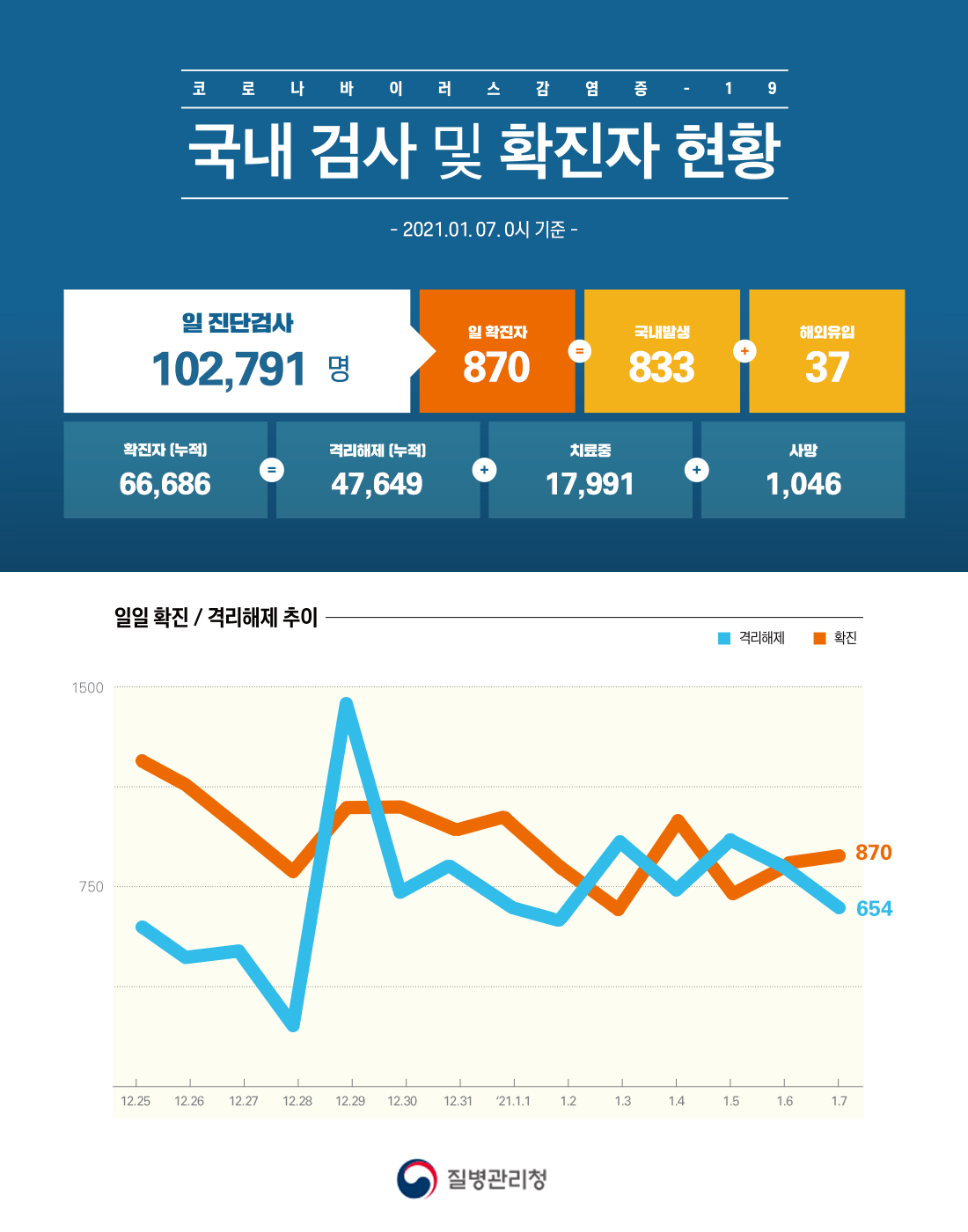일일 확진자는 870명(01.07 00시 기준), 누적 확진자는 66,686명이라고 합니다.