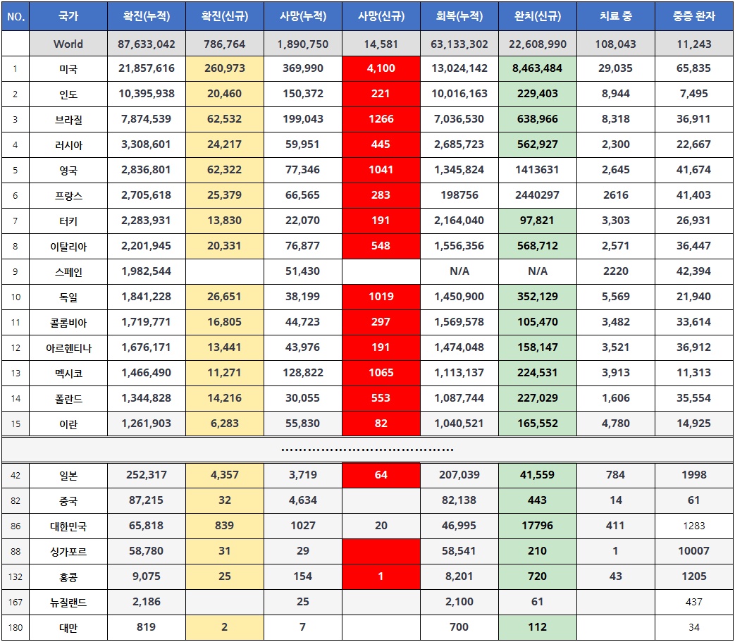 이번에 발병한 변이 코로나로 인해 영국의 확진자수가 많이 늘어나서, 영국이 5위가 되었네요.