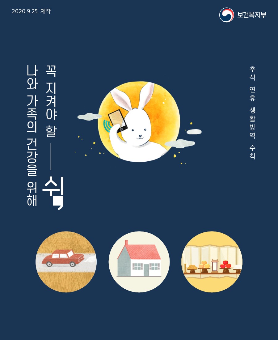 보건복지부에서 '추석 연휴 기간 동안 지켜야 할 핵심 생활 방역 수칙'에 대한 좋은 자료가 있어 퍼옵니다.