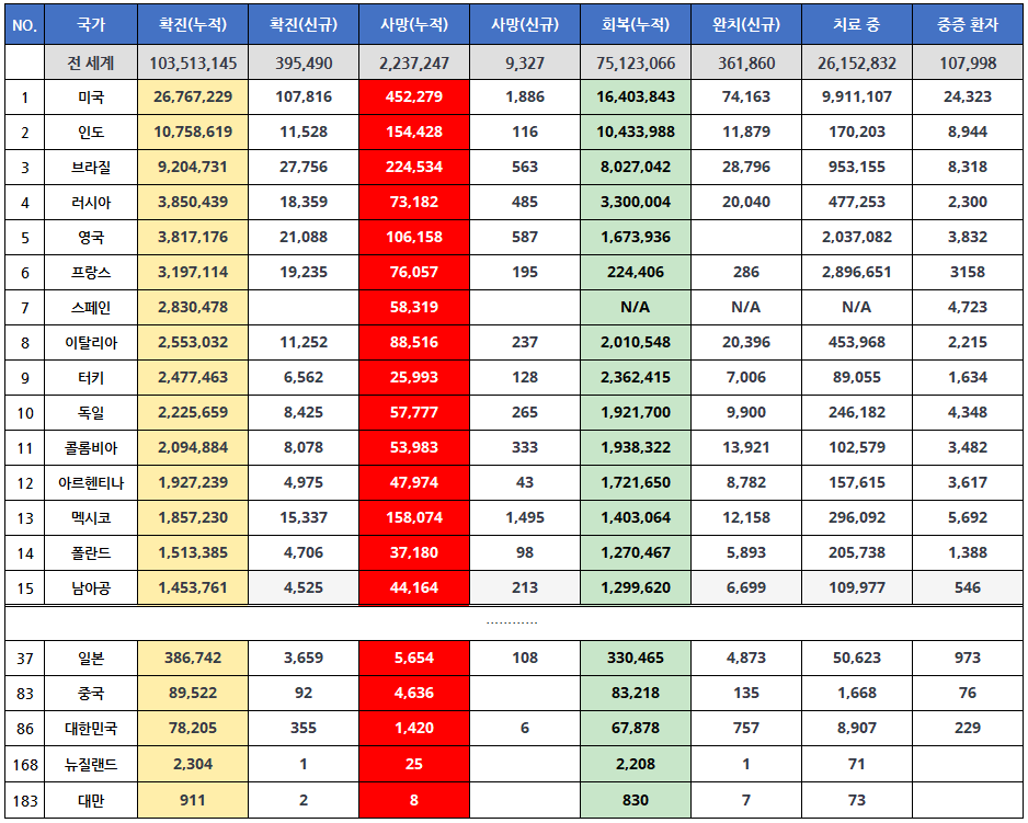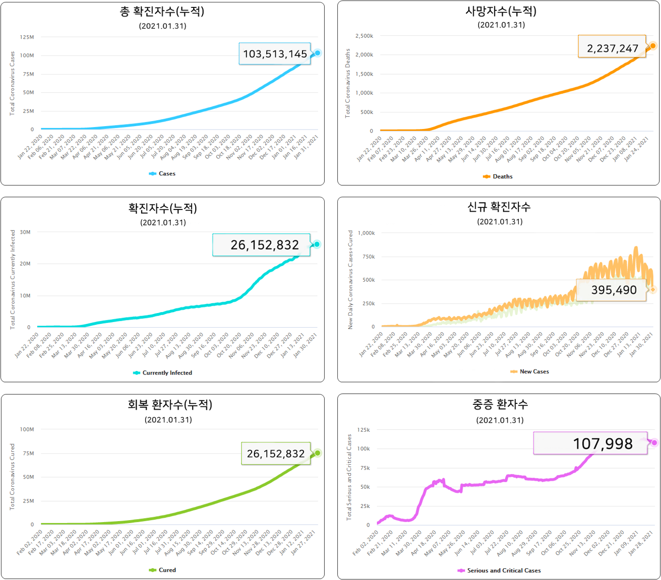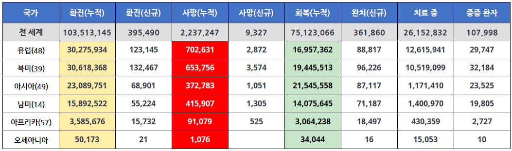 누적된 총 확진자수는 1억 명이 넘었고, 누적된 사망자수도 2백만 명이 넘습니다.
