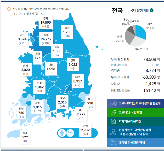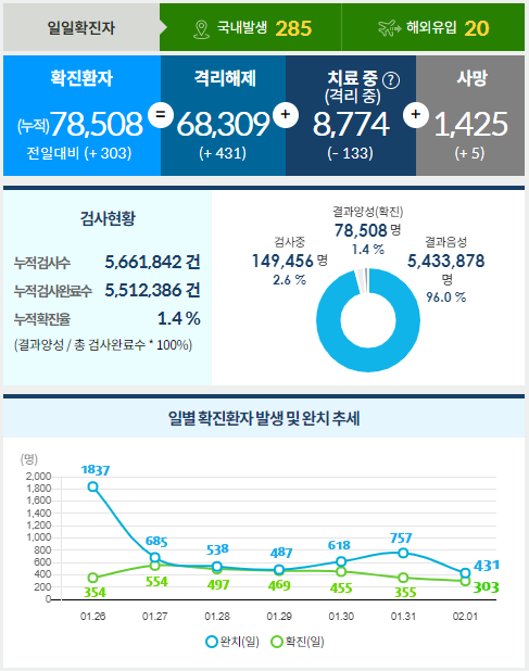 일일 확진자는 303명(2.1 00시 기준), 누적 확진자는 78,508명이라고 합니다.