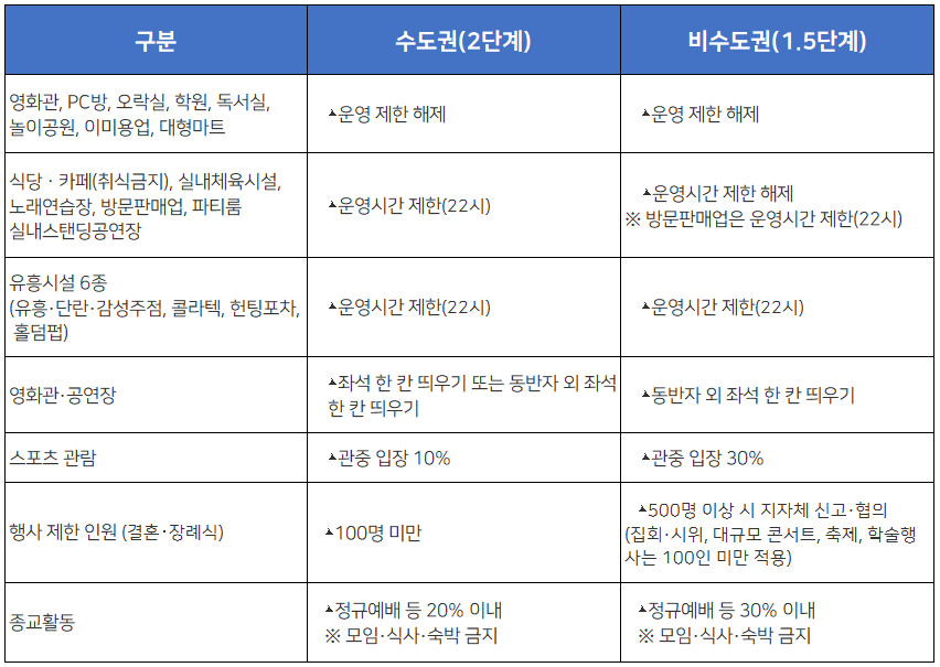 - 영화관·공연장의 경우 1.5단계에서는 동반자 외 좌석 한 칸 띄우기로 운영이 가능하며, 스포츠 관람의 경우 정원의 30%만 입장·관람이 가능합니다.