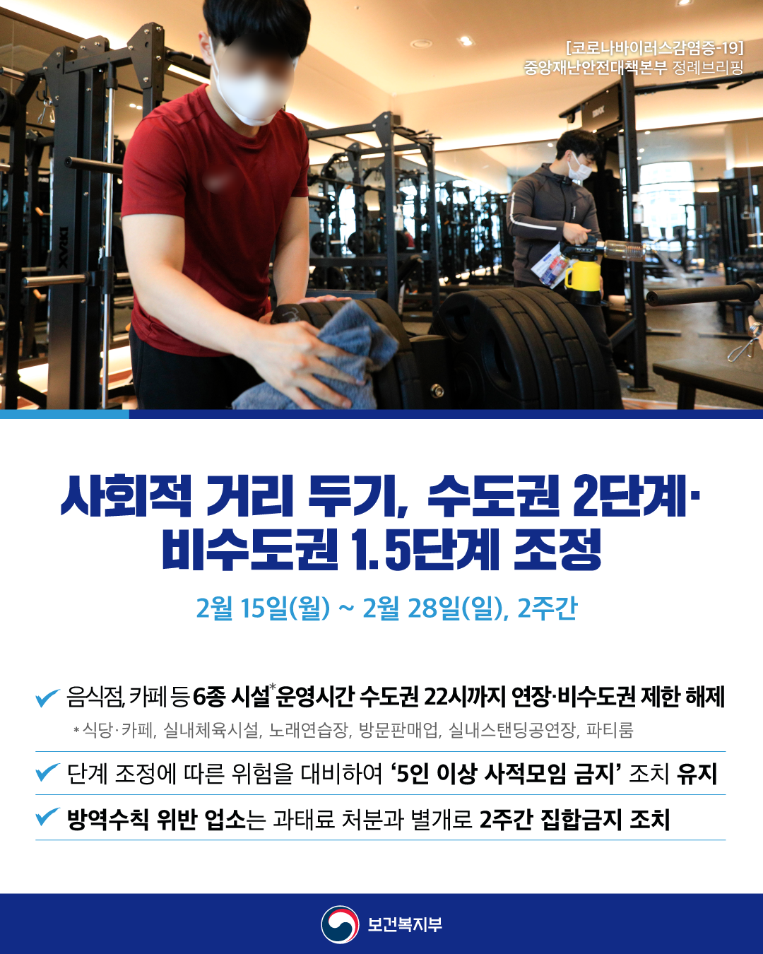 - 비수도권은 2월 15일(월) 0시부터 2월 28일(일) 24시까지 사회적 거리두기가 1.5단계로 조정됩니다.