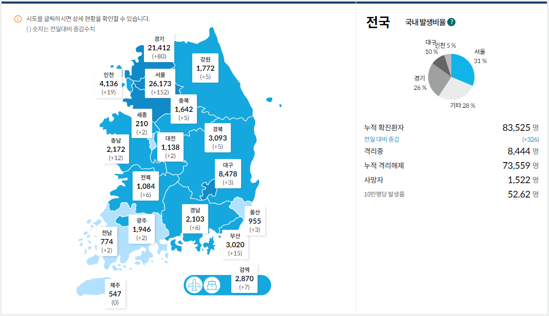 일일 확진자는 326명(2.14 0시 기준), 누적 확진자는 83,525명이라고 합니다.