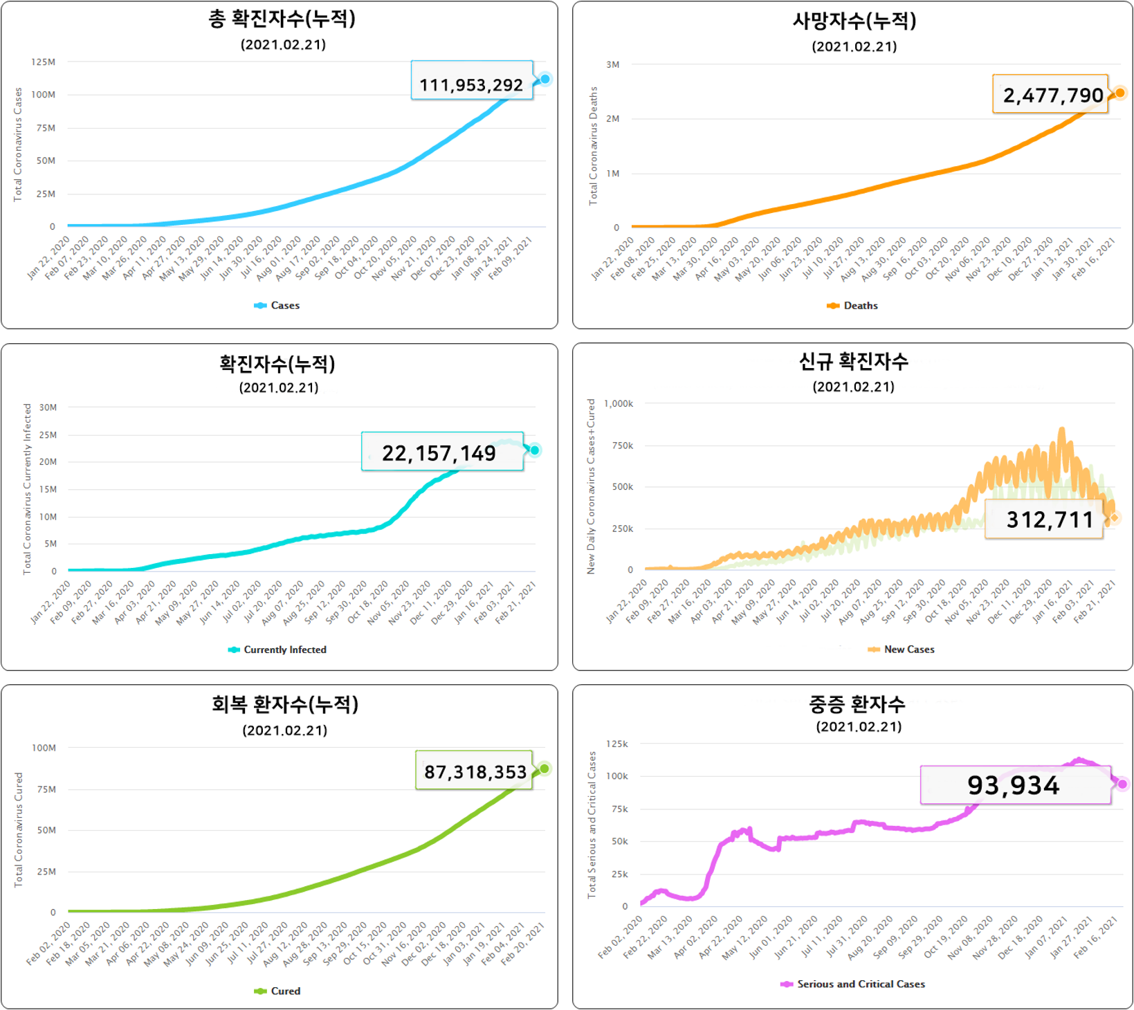 국가별 시차가 있어, 2021년 2월 22일 자료는 전체 국가 수치를 포함하지 않아서