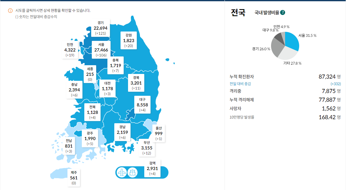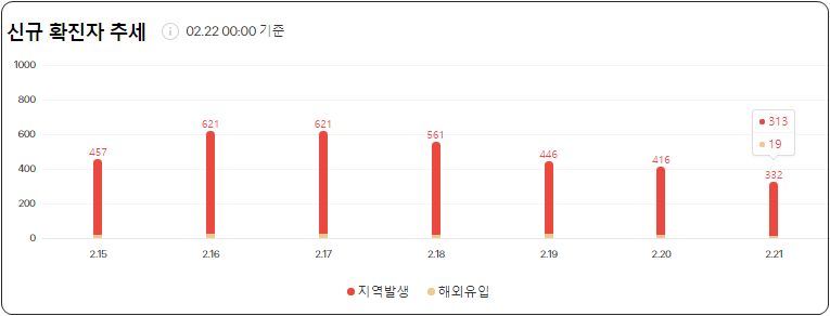 일일 확진자는 332명(2.22 00시 기준), 누적 확진자는 87,324명이라고 합니다.