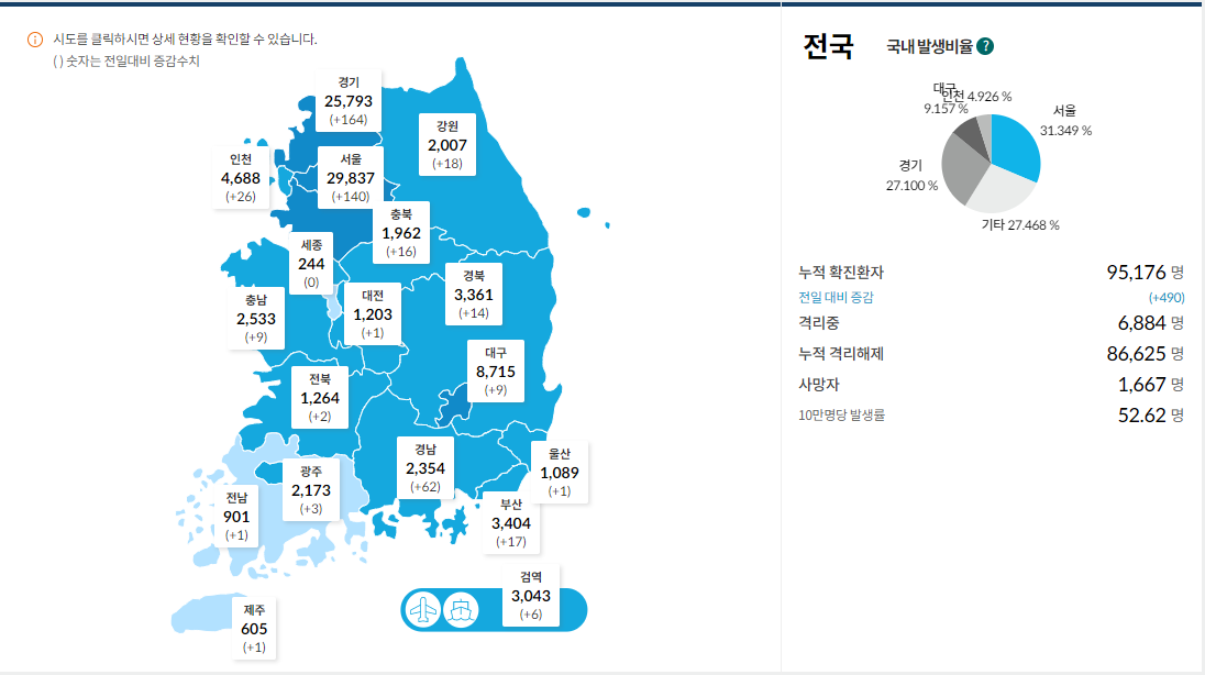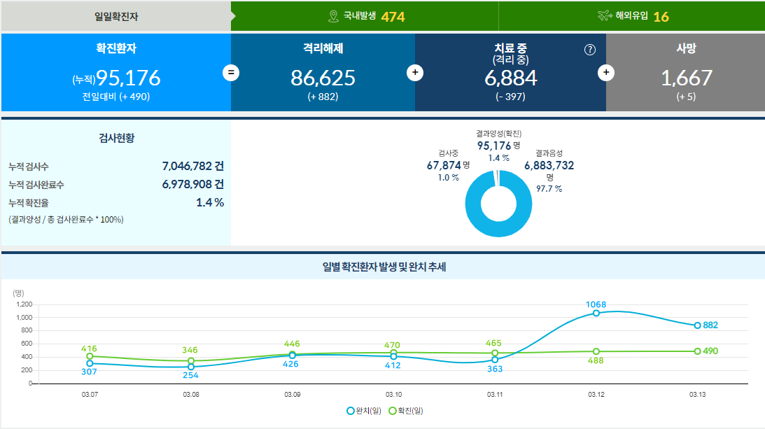 일일 확진자는 490명(3.13 0시 기준), 누적 확진자는 95,176명,