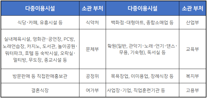 - 수도권은 2단계로 유지됨에 따라 영화관, PC방, 오락실, 학원, 독서실, 놀이공원, 이미용업, 대형마트 등의 다중이용시설은 별도 운영시간제한은 없음