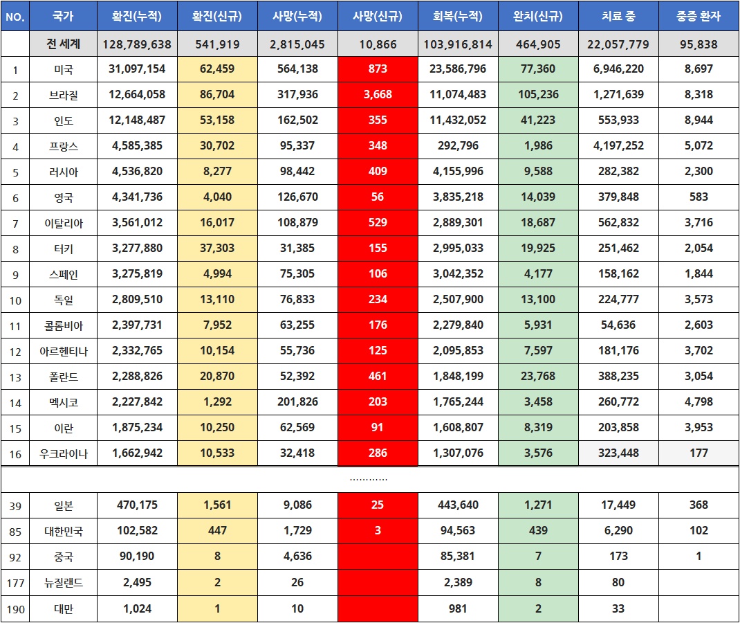 반면 싱가포르(60,381, 101위), 태국(28,863, 116위), 홍콩(11,468, 137위), 베트남(2,594, 176위)은 신규 확진자수도 적고, 낮은 순위에 랭크되어 있습니다.