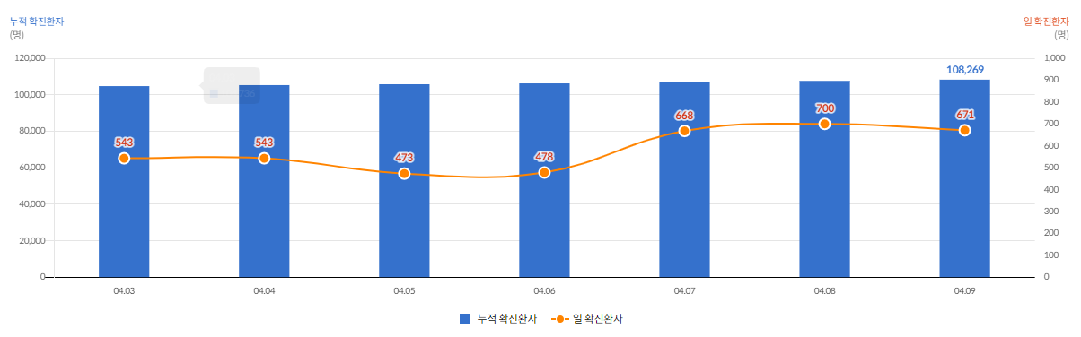 일일 확진자는 671명(4.9 0시 기준), 누적 확진자는 108,269명,