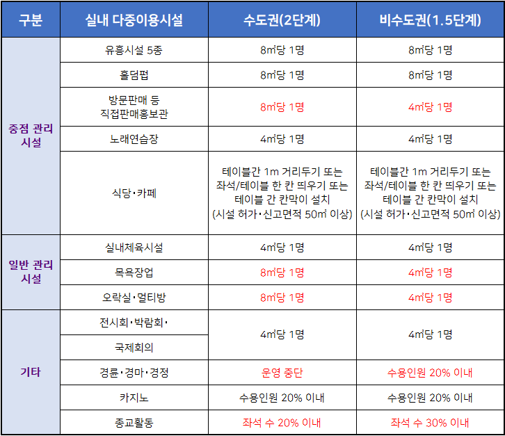 - 영화관, PC방, 오락실, 학원, 독서실, 놀이공원, 이미용업, 대형마트 등의 다중이용시설은 별도 운영시간 제한 없음