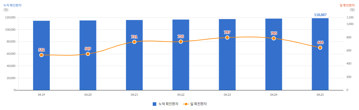 일일 확진자는 644명(4.25 0시 기준), 누적 확진자는 118,887명,
