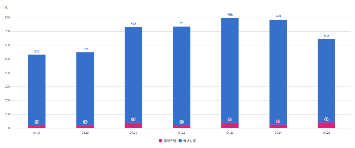 확진자수가 지속적·점진적인 증가 양상을 보였고, 며칠 동안 확진자수가 800명에 육박함에 따라