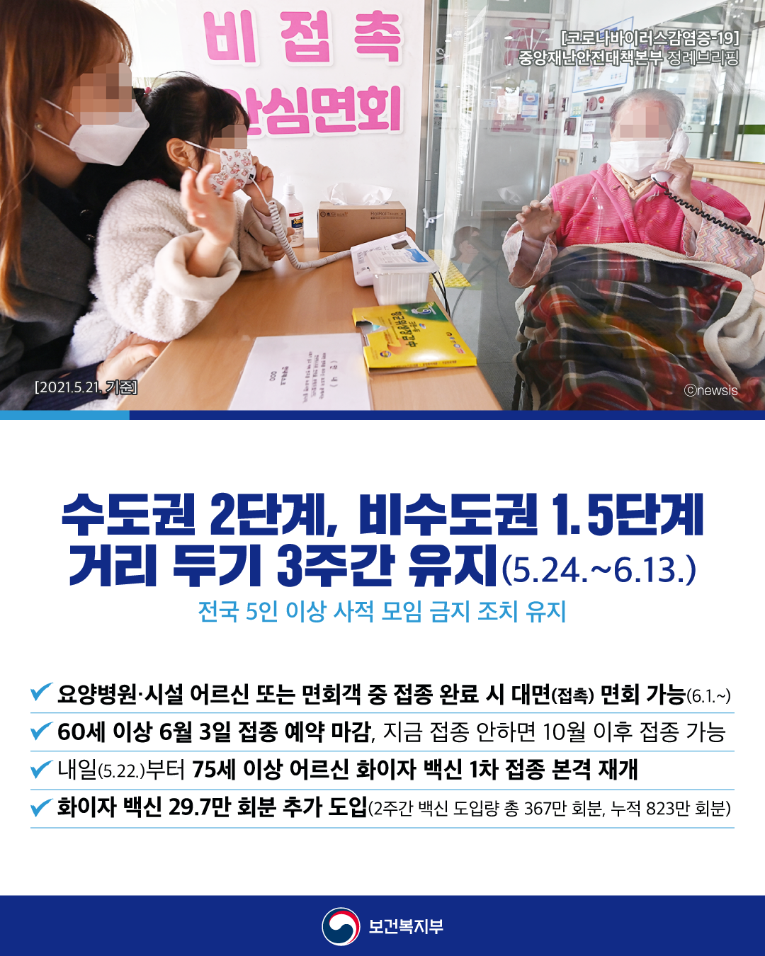 [코로나19 #46] 사회적 거리두기 3주간 유지(5.24~6.13), 백신접종자 요양시설 대면 면회 확대