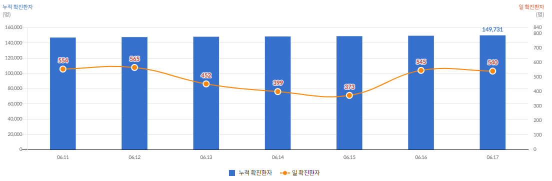 일일 확진자는 540명(6.17 00시 기준), 누적 확진자는 149,731명이라고 합니다.