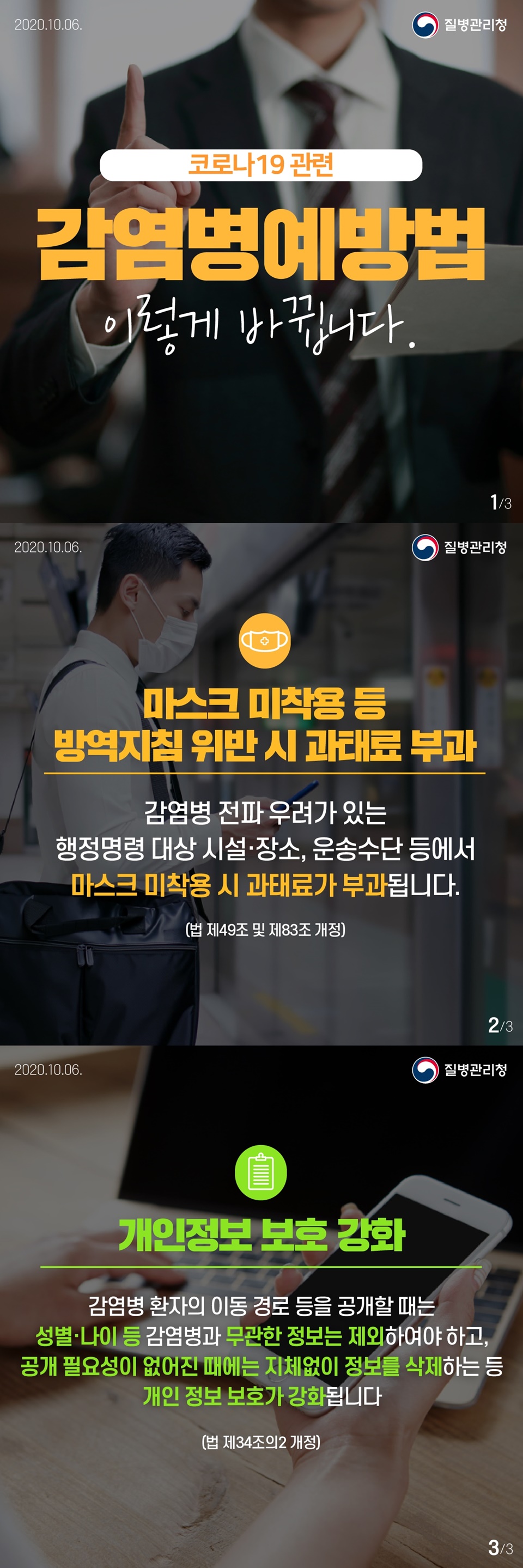마스크 착용 의무화 조치에도 불구하고 마스크를 착용하지 않을 경우 10만 원의 과태료를 부과하는 내용의 개정 감염병 예방법이 10월 13일부터 시행돼 한 달의 계도기간을 거쳐 11월 13일부터 실제 적용됩니다.(법 제49조 및 제83조 개정)