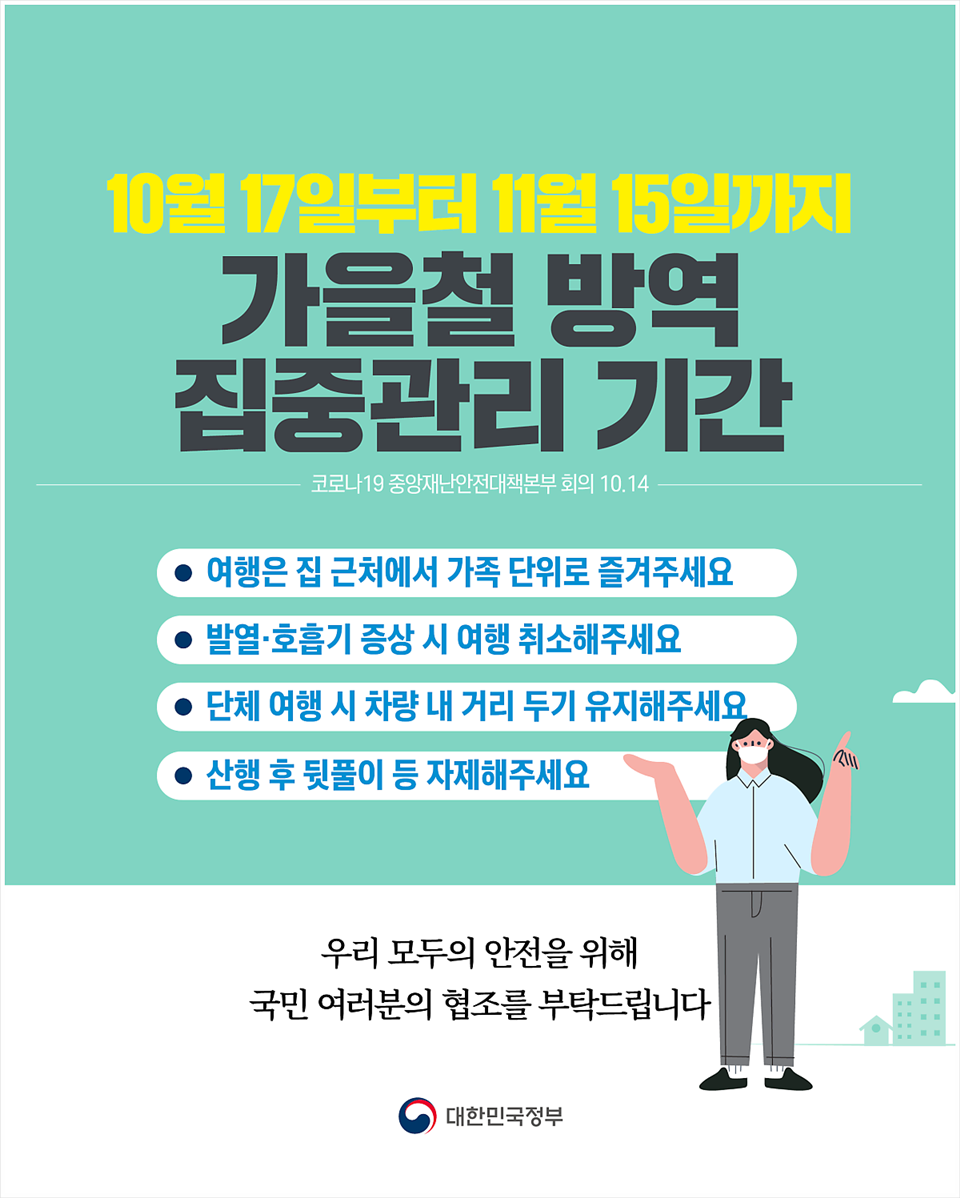 이에 정부에서는 단풍 절정기인 10월 17일(토)부터 11월 15일(일)까지를 방역 집중관리 기간으로 정하고