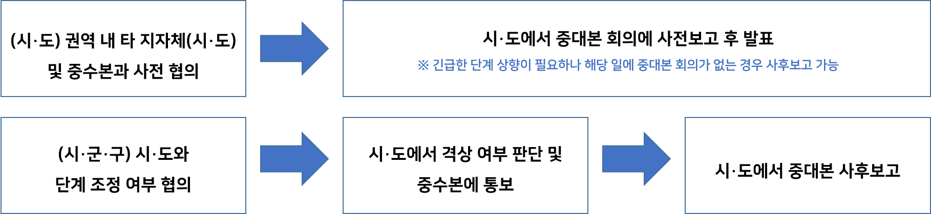 - 시‧도 단위의 단계 조정 시, 권역 내 타 지자체(시‧도) 및 중수본과 사전 협의하고, 시도‧에서 중대본 회의에 사전보고 후 발표 그리고 시‧군‧구 단위의 단계 조정 시, 시‧도에서 격상 여부 판단 및 중수본에 통보하고, 중대본에 사후보고