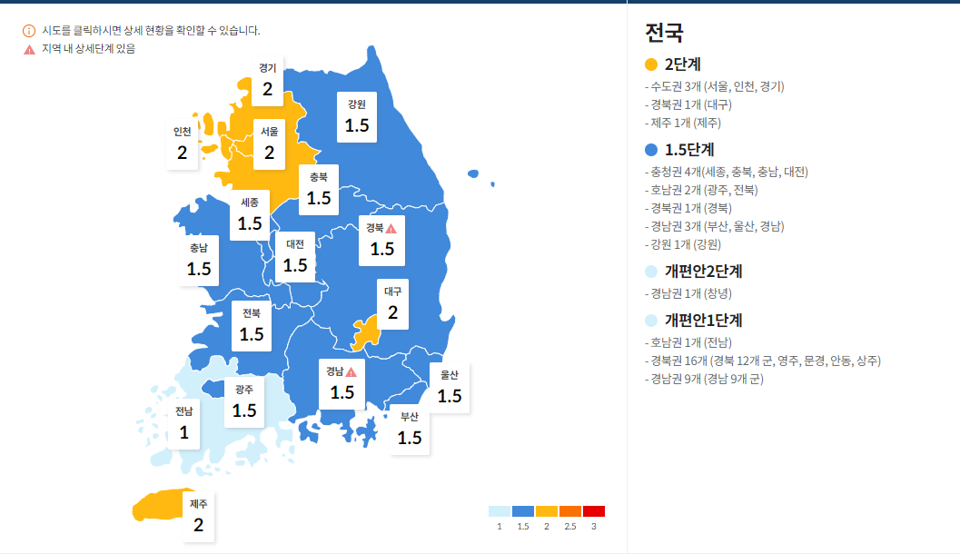 - 지자체가 단계 기준을 충족하는 경우, 지역별로 1~3단계 조정이 가능하도록 하여 지역의 자율과 책임을 강화