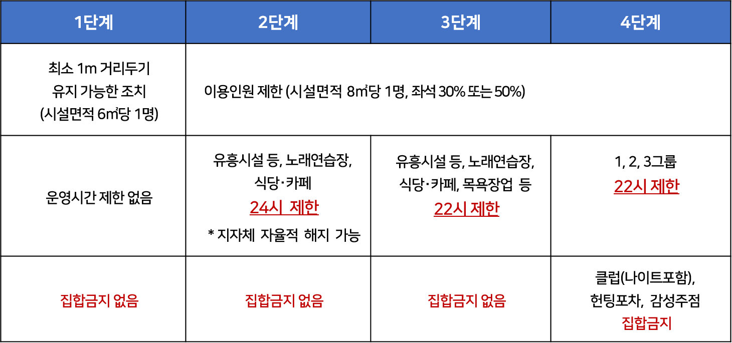 - 4단계에서 방역 위험도가 높은 1그룹 시설 중 클럽‧나이트, 헌팅포차, 감성주점에만 외출을 금지하는 집합금지 적용