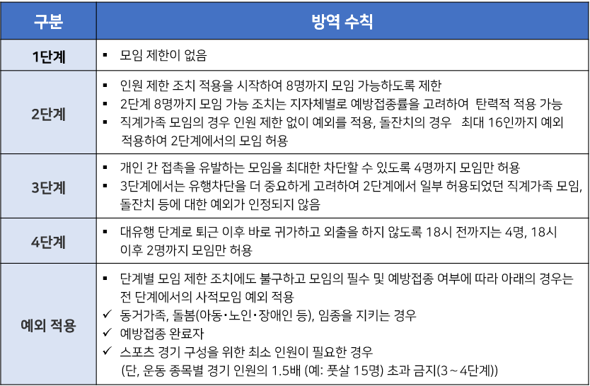 [ 모임·행사·집회 단계별 방역수칙 및 예외 사항 ]