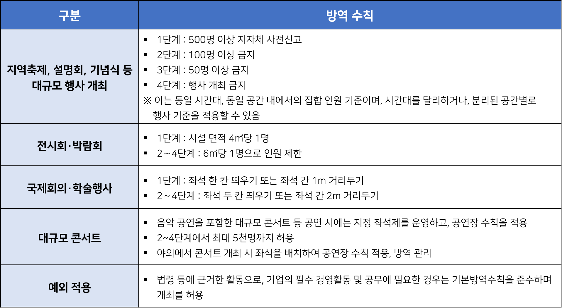 - 2단계부터 모임/행사‧식사‧숙박을 금지하되, 위험도 등을 고려하여 2단계(100인 미만), 3단계(50인 미만) 실외행사를 식사·숙박 금지, 사전 준비 모임 최소화, 큰소리로 함께 노래 금지 등 방역수칙 준수 전제하에 예외적으로 허용
