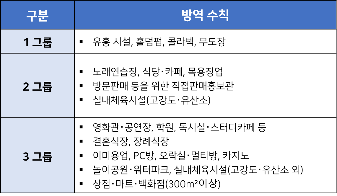 - 기본수칙에 더해 시설 환경 및 활동 특성에 따라 감염 위험도가 높은 행동은 차단할 수 있도록 시설별 맞춤형 수칙도 마련