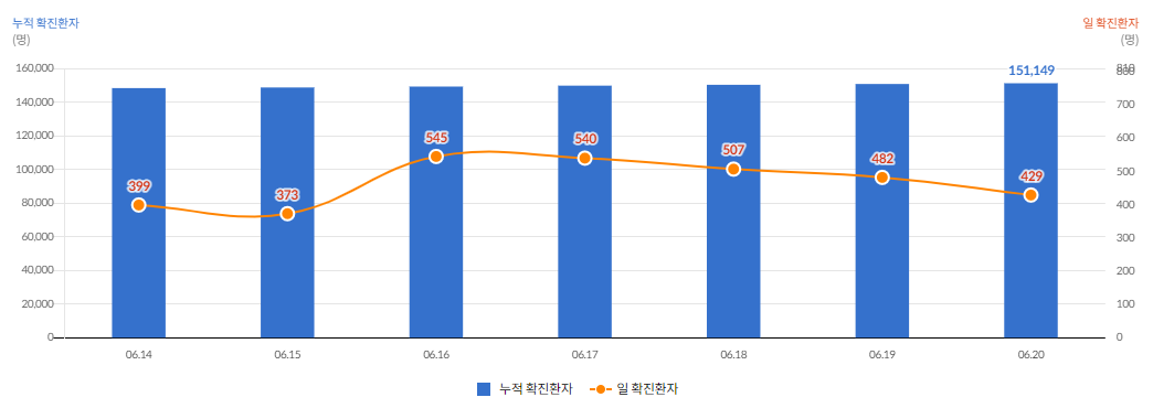 일일 확진자는 429명(6.13 00시 기준), 누적 확진자는 151,149명,