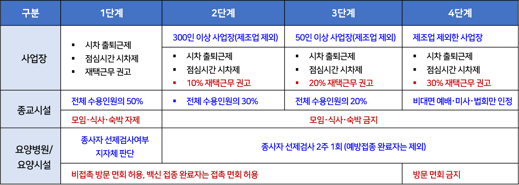 - 4단계에서는 제조업을 제외한 모든 사업장은 시차 출퇴근제, 점심시간 시차제, 재택근무 30% 권고 적용