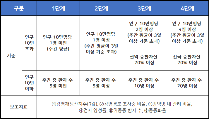 - 인구 10만명 당 주간 하루 평균 환자 수 또는 중환자 병상 여력을 충족하면서 권역별 감염재생산지수(R) 등 보조지표를 함께 고려하여 단계 조정