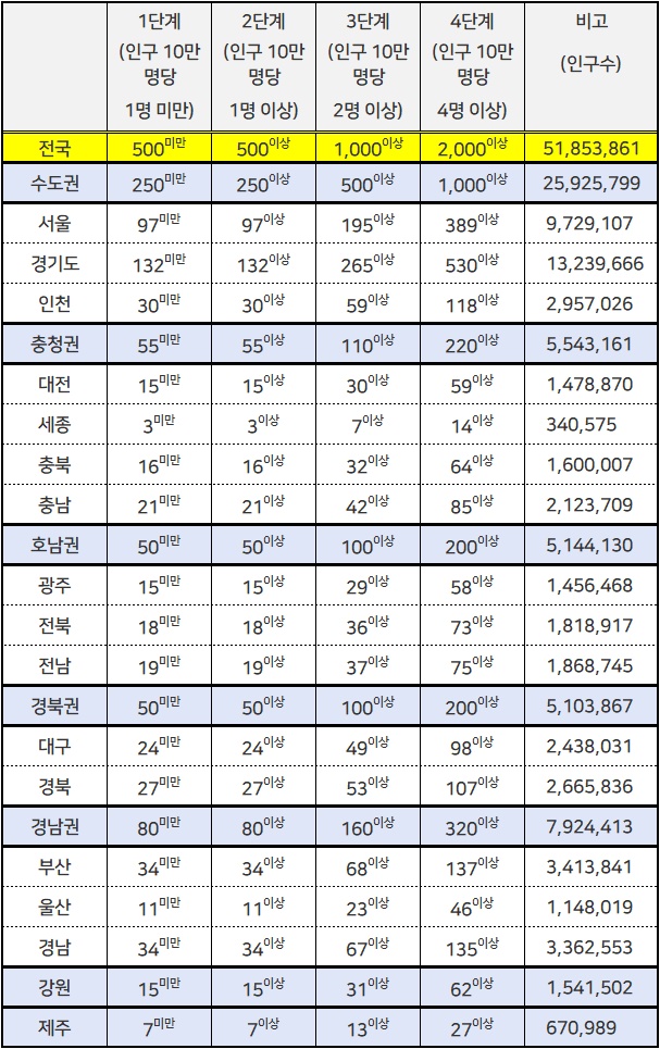 - 단, 인구 10만명 이하 지역은 ‘주간 총 환자 수’라는 별도의 기준을 마련하여 적용