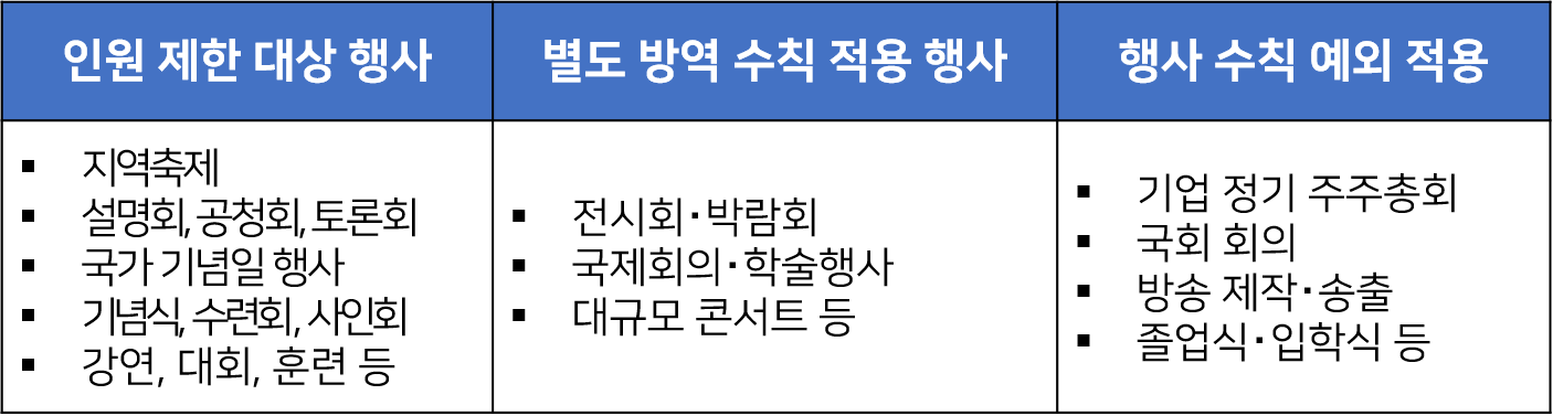 [ 모임·행사·집회 단계별 방역수칙 및 예외 사항 ]