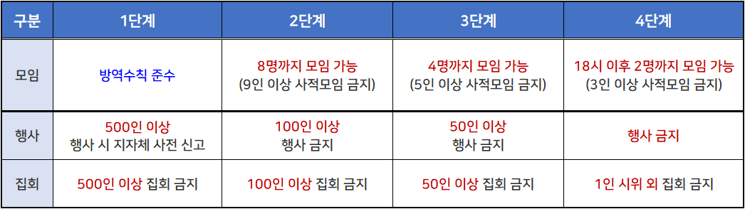 - 결혼식‧장례식은 사적모임 범주에 포함하지 않으며, 2단계 100인, 3단계 50인 이상 금지, 4단계 친족만 허용하는 별도 방역조치 준수