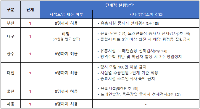 - (특별·광역시) 부산광역시·광주광역시·대전광역시·울산광역시·세종특별자치시는 사적모임을 8인까지 허용하고, 대구광역시는 지역 협의체를 통해 논의 후 6월 29일에 별도 발표할 예정임