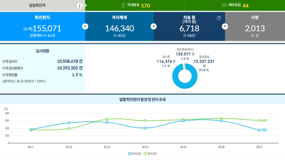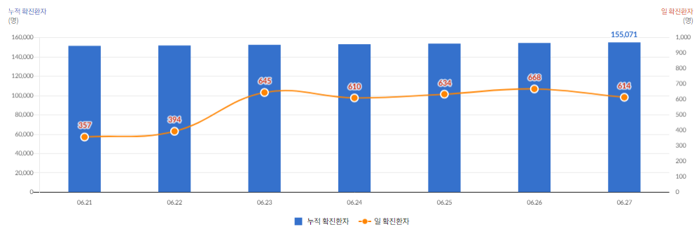 일일 확진자는 614명(6.27 00시 기준), 누적 확진자는 155,071명,