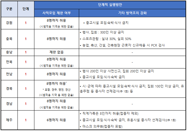 - 현재 강원도, 전라북도, 경상북도, 경상남도의 시범적용 지역은 사적모임의 제한이 없음