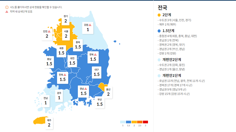 - 권역 및 지자체(시·도, 시·군·구)별로 거리두기 단계(1~3단계)의 조정 가능