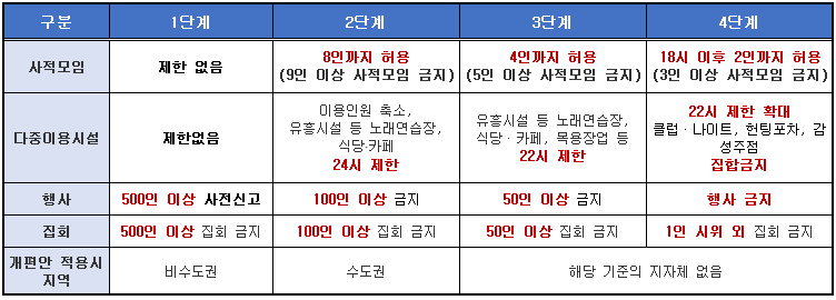 - 억제(1단계), 지역 유행/인원 제한(2단계), 권역 유행/모임 금지(3단계), 대유행/외출금지(4단계)로 구분