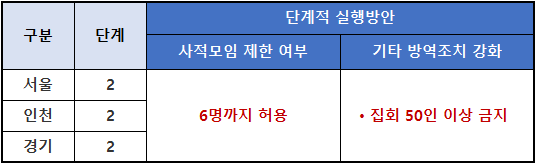 - 서울특별시, 인천광역시, 경기도는 사적모임은 6인까지 허용