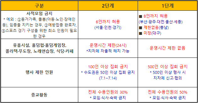 - 단계적 실행방안에 따라 수도권은 50인 이상 집회는 금지(7.1∼7.14)