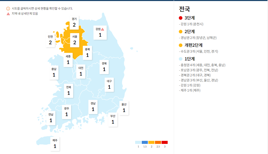 현재 전국의 '개편된' 사회적 거리두기 단계는 다음과 같습니다.