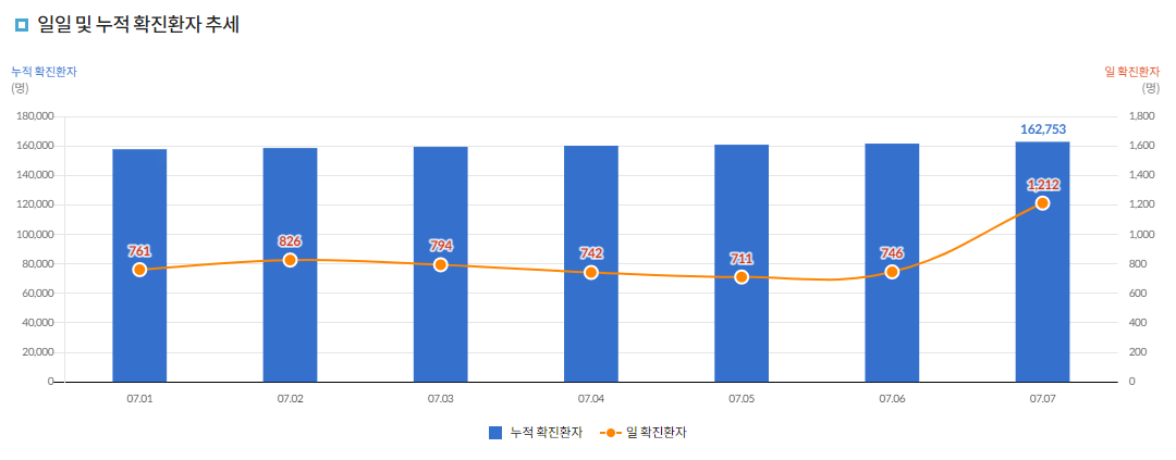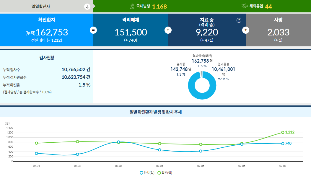일일 확진자는 1,212명(7.7 00시 기준), 누적 확진자는 162,753명,