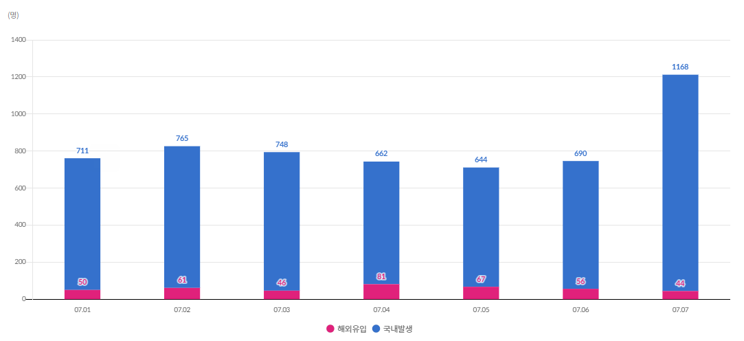 오늘 7월 7일 발표한 확진자수는 1,168명으로 특히 수도권 환자는 990명, 그중 서울은 577명으로
